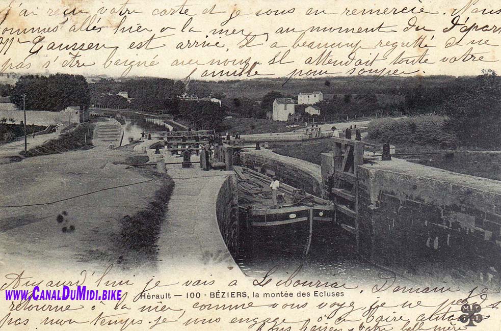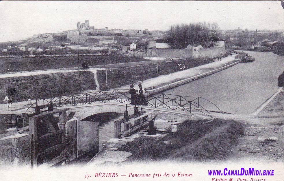 Pictured below: Canal Du Midi in Beziers. Epanchoirs du Trianon at the Ecluse d'Arièges. The highway A9 was build during the 1960's and it can be seen crossing the canal in the new picture. Also notice the size of the trees in the old photo (taken around 1900). They are the same size as the newly planted trees right now elsewhere along the canal! The lock-keeper's house had its roof raised a bit, which is why it is not lining up in the photos anymore.